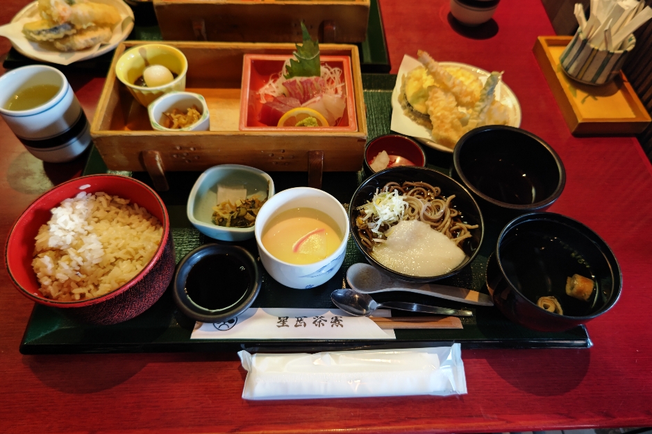 内容は、刺身3点盛・小鉢・天ぷら・わんことろろそば・茶碗蒸し・じゃこご飯・ミニぜんざいとバランスの良い品ぞろえでした!
